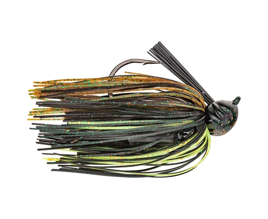 Do as Denny Brauer does when he needs to generate some action quickly and tie on a Premier™ Pro-Model® Jig from Strike King®. The Premier Pro-Model Jig’s durable Mirage silicone skirt produces loads of strike-provoking action and the extra-loud double barrel rattle has four BBs to ensure maximum rattle attraction. The double barrel rattle’s innovative design also helps keep bait trailers in the proper position and has a keeper for soft plastics. A thick fiber weedguard lets you pitch, flip or swim the Premier Pro-Model Jig into or through just about any heavy cover. Black nickel hook is all business.